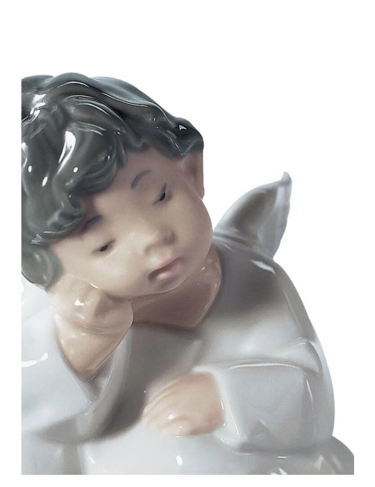 Un piccolo angelo affascinante ci guarda dal cielo con un'espressione tra comprensione e malinconia.