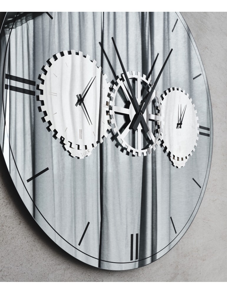 Il fascino di uno specchio si unisce alla praticità di un orologio a parete moderno. L'orologio specchiato Times è un accessorio di design decorativo e allo stesso tempo funzionale. È infatti composto da tre quadranti da posizionare su fusi orari differenti. Il quadrante di sinistra è regolabile su New York, Londra o Roma, mentre il quadrante di destra su Mosca, Tokyo o Sydney. Le città sono incise sullo specchio rotante sottostante, e ciascuno ha la libertà di decidere su quale coppia di città sintonizzarsi. Il risultato è un orologio a parete di design incisivo e prezioso, che ti invita a viaggiare con la fantasia.