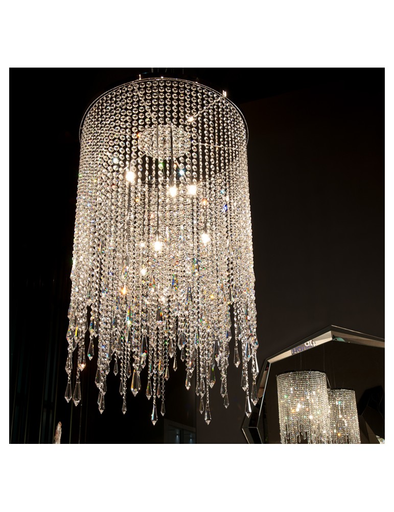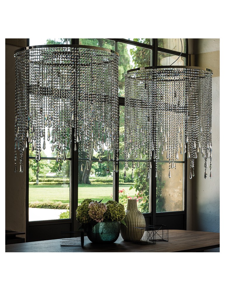La famiglia di sofisticate lampade Venezia è composta da lampadari eleganti di diverse dimensioni, da una raffinata piantana di design, la cui versione in miniatura risulta un'affascinante lampada da tavolo moderna e in ultimo da un'altrettanto preziosa versione a parete. Al telaio in acciaio cromato sono applicate delle catenelle con pendagli in cristallo di lunghezze variabili, che sfoggiano il fascino e l'eleganza degne di un prezioso gioiello. Questa lampada moderna in cristallo è frutto dell'unione tra le tecniche di produzione d'avanguardia e la cura del dettaglio che caratterizza la manifattura di alta qualità.