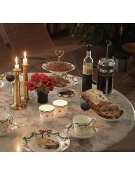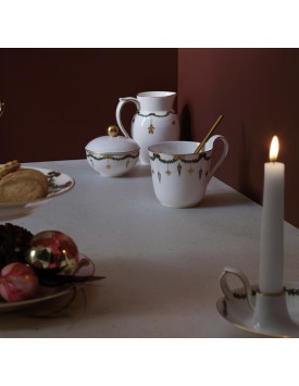 Le festose ghirlande di abete rosso che bordano piatti, ciotole e tazze sono ornate da fiocchi in nastro di seta e decorazioni natalizie, creando un servizio ricco ed elegante, che farà da sfondo a tutti i vostri allegri pasti delle feste.