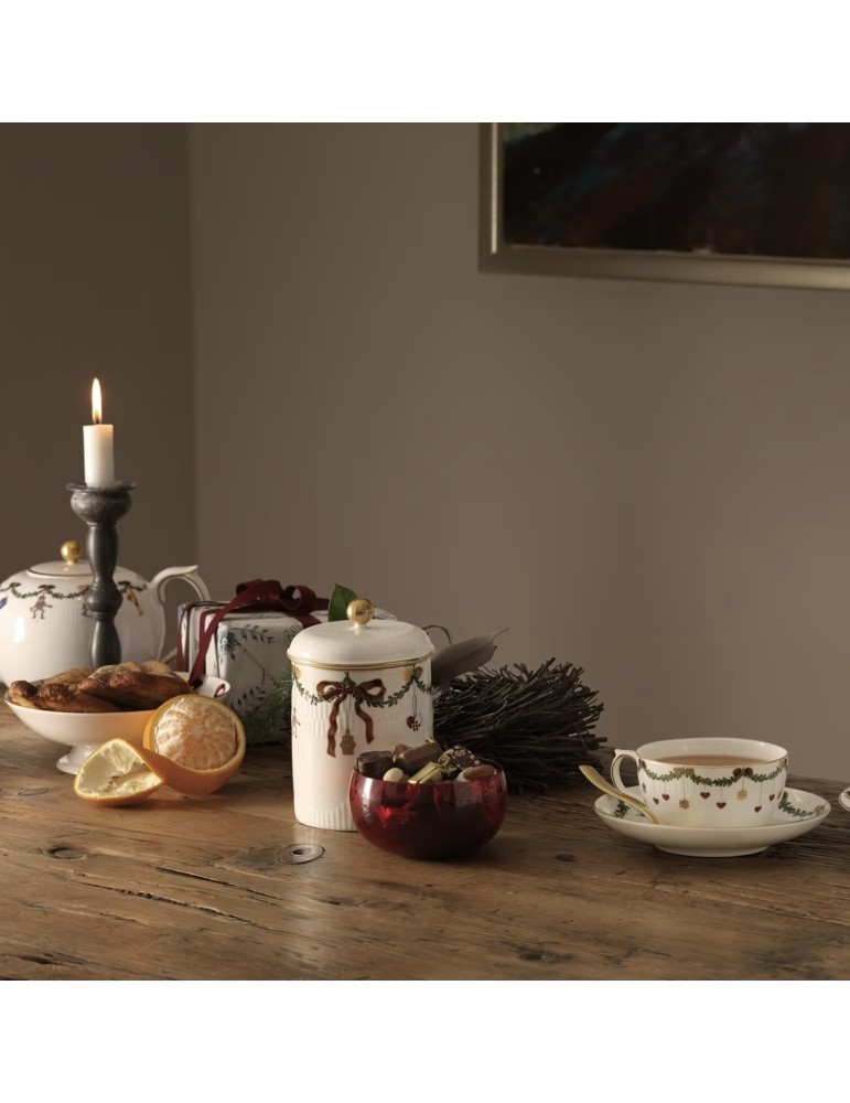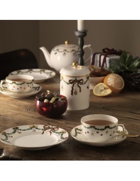 Le festose ghirlande di abete rosso che bordano piatti, ciotole e tazze sono ornate da fiocchi in nastro di seta e decorazioni natalizie, creando un servizio ricco ed elegante, che farà da sfondo a tutti i vostri allegri pasti delle feste.