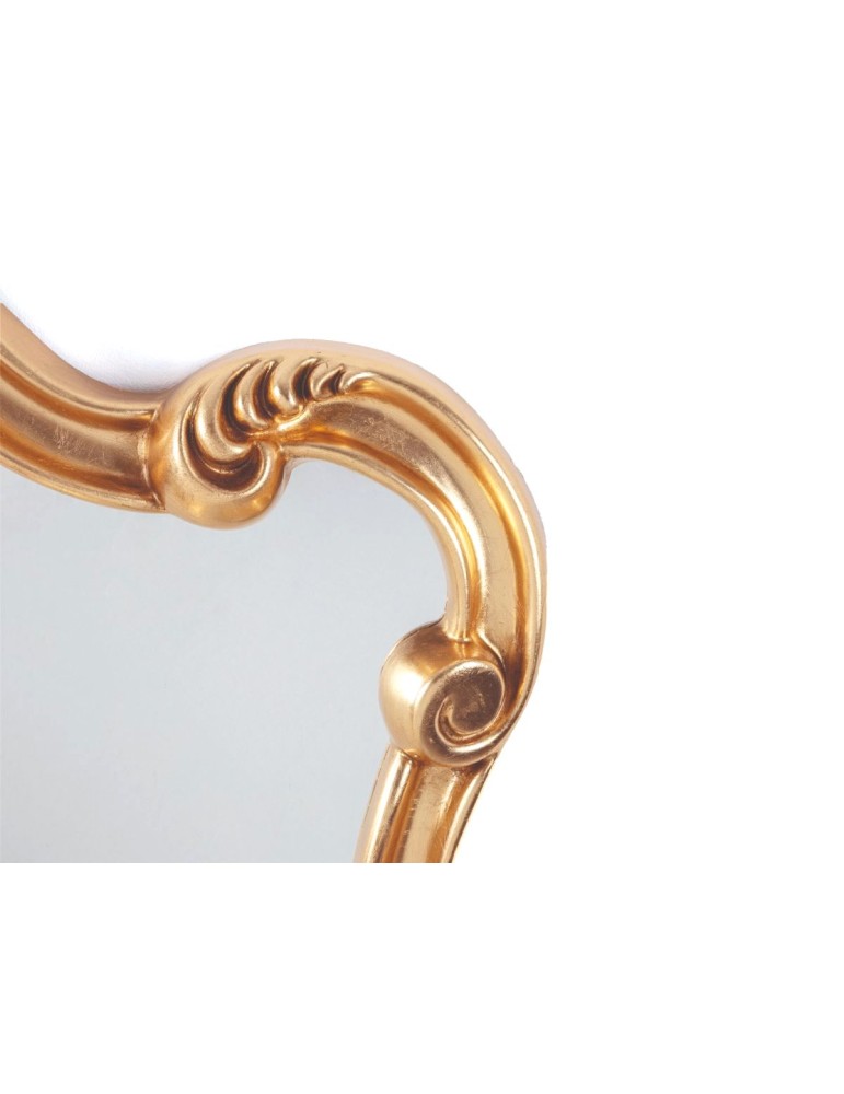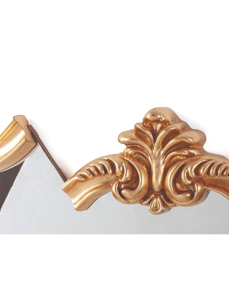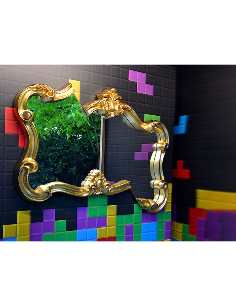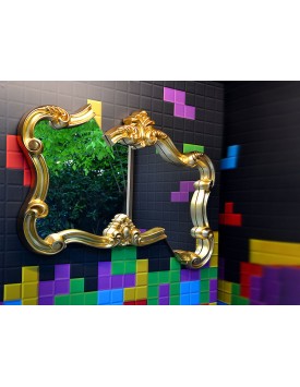 Forme tradizionali reinterpretate con originalità. La cornice dorata dello specchio si scompone dando vita ad una superficie con livelli complanari risultanti da un'impossibile traslazione. Lo specchio sembra essere in movimento, come per magia.