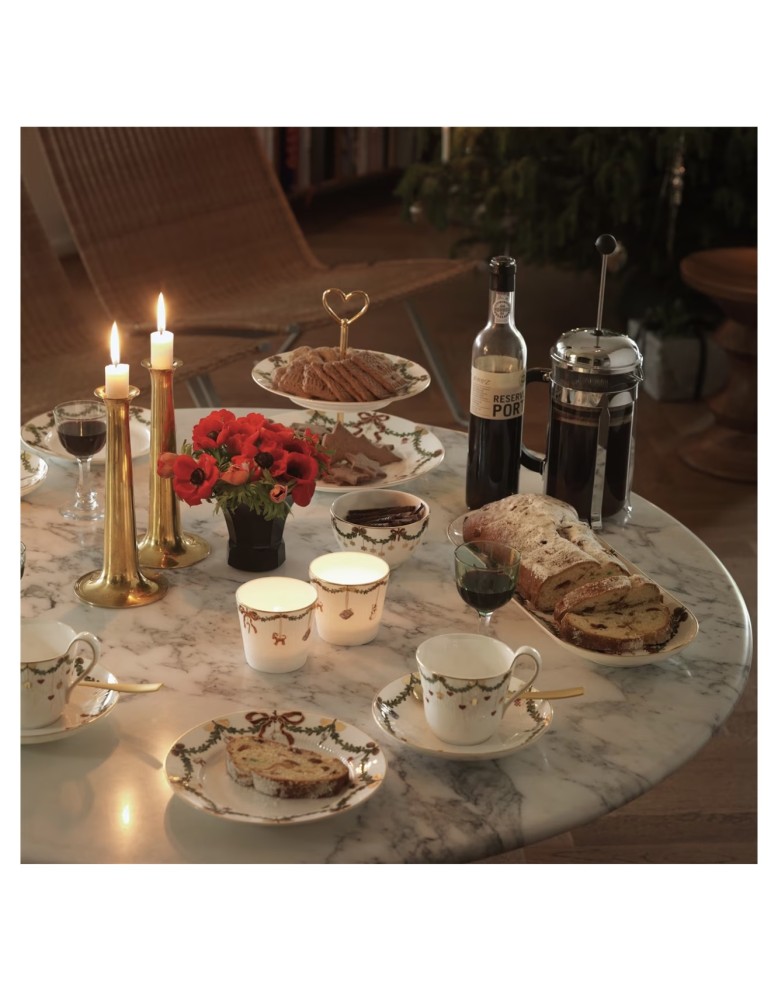 È qui che l'amato servizio per la cena di Natale di Royal Copenhagen ha preso vita ed è diventato parte di molte tradizioni festive. Le festose ghirlande di abete rosso che bordano piatti, ciotole e tazze sono ornate da fiocchi in nastro di seta e decorazioni natalizie, creando un servizio ricco ed elegante, che farà da sfondo a tutti i vostri allegri pasti delle feste.
