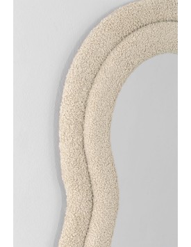 La cornice dello specchio è realizzata in velluto, un tessuto morbido e lussuoso che aggiunge una texture ricca e una sensazione di calore e comfort visivo.