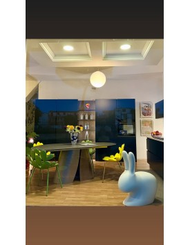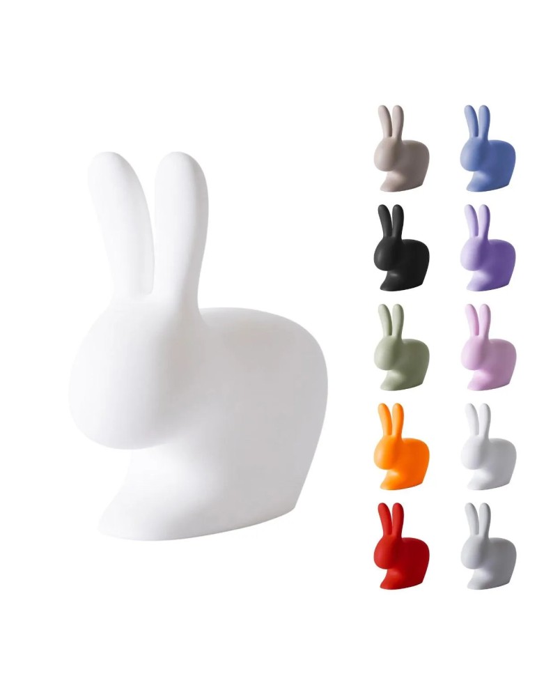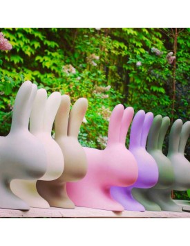La sedia Qeeboo Rabbit, disegnata da Stefano Giovannoni può essere utilizzata appoggiandosi alle orecchie o sul lato opposto, cavalcandola e appoggiando gli avambracci sulle orecchie.