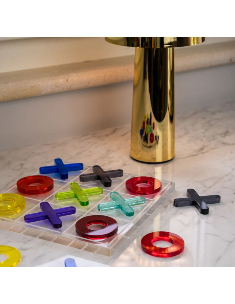 Il Set Tris Vesta reinventa un classico senza tempo con pedine multicolor – dal giallo al fucsia, dal blu al tiffany fino al viola – racchiuse in un’elegante scatola nera,