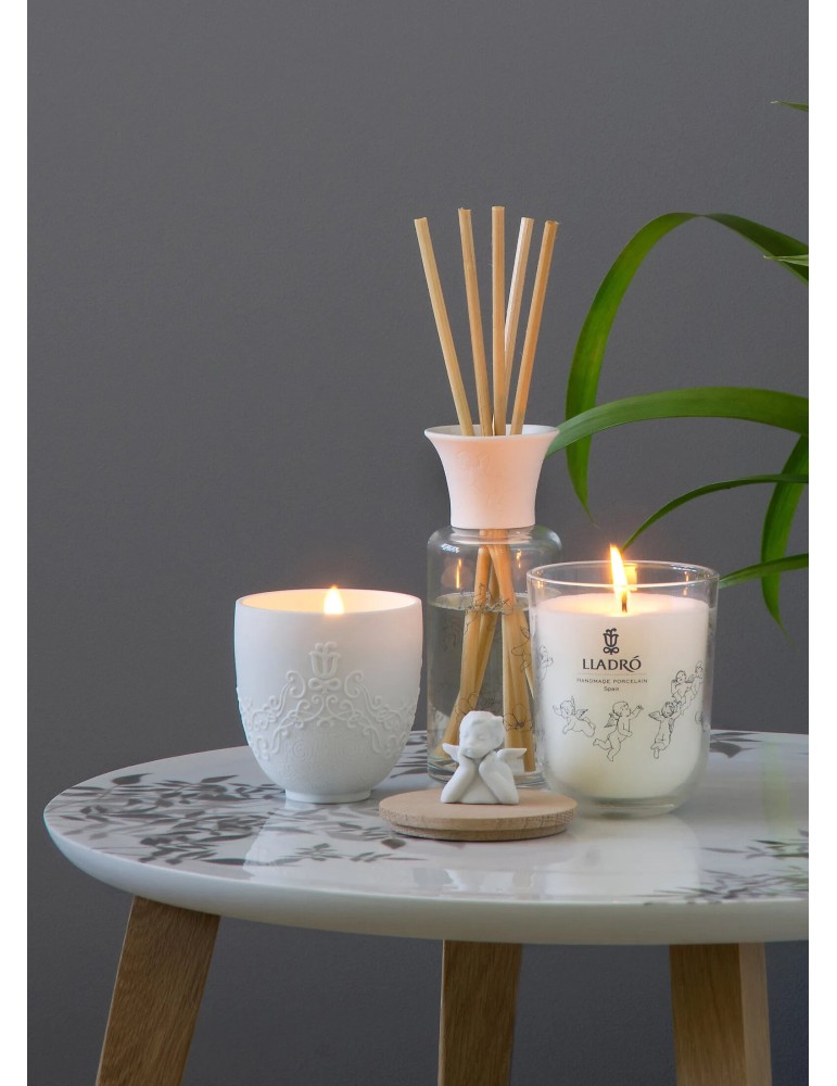 Candela profumata per ambiente dall'aroma floreale e coperchio in legno di rovere naturale decorato con angelo in porcellana bianca opaca. Il bicchiere è in vetro decorato con cherubini e fiori.
