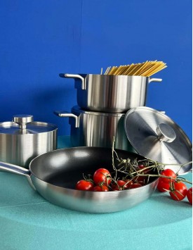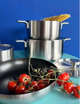 La linea di pentole Bones di Alessi, realizzata in acciaio inossidabile con fondo magnetico, è perfetta per la cottura ad induzione. Questo set di 7 pezzi ti aiuterà a cucinare con stile e funzionalità, con un design moderno e lineare adatto a ogni tipo di cucina.